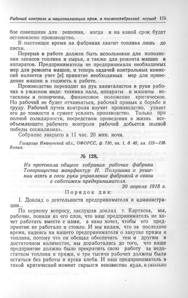 Из протокола общего собрания рабочих фабрики Товарищества мануфактур Н. Полушина о решении взять в свои руки управление фабрикой в связи с саботажем предпринимателя. 20 апреля 1918 г. // Госархив Ивановской обл. ОФОРСС, ф. 701, oп. 1, д. 2, л. 63. Подлинник.