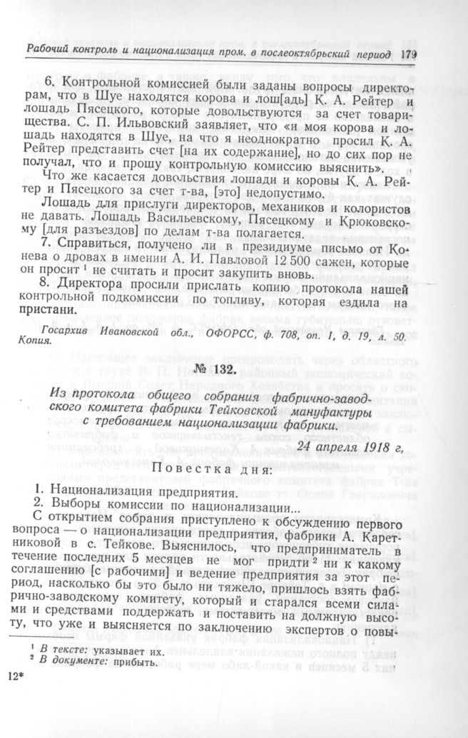 Материалы по истории СССР. Вып. III. Рабочий контроль и национализация крупной промышленности в Иваново-Вознесенской губернии. — М.: Изд-во АН СССР, 1956.