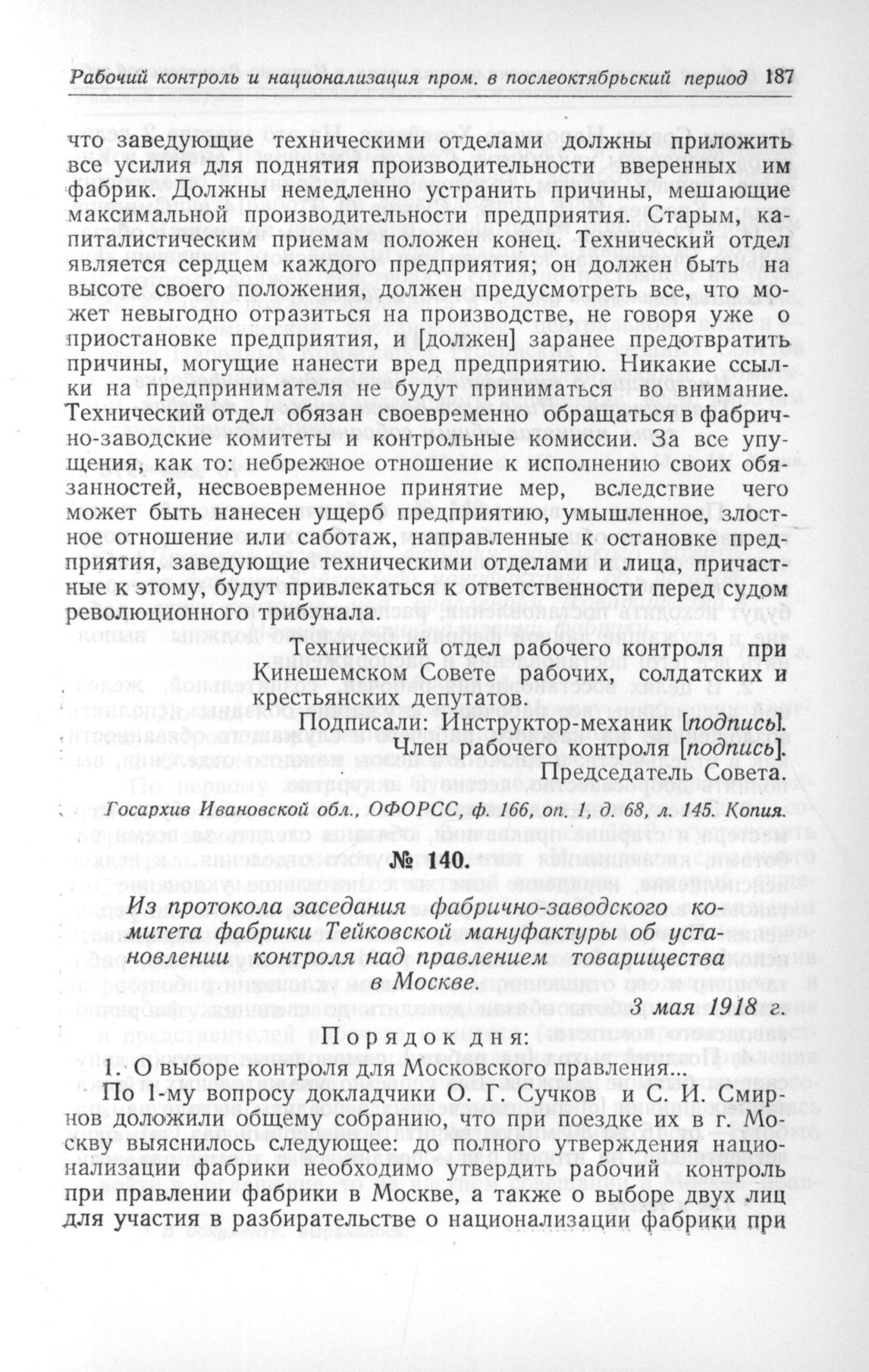 Из протокола заседания фабрично-заводского комитета фабрики Тейковской мануфактуры об установлении контроля над правлением товарищества в Москве. 3 мая 1918 г. // Госархив Ивановской обл., ОФОРСС, ф. 705, oп. 1, д. 9, л. 36. Подлинник.