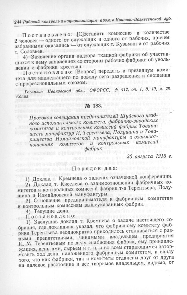 Протокол совещания представителей Шуйского уездного исполнительного комитета, фабрично-заводских комитетов и контрольных комиссий фабрик Товариществ мануфактур И. Терентьева, Полушина и Товарищества Измайловской мануфактуры о взаимоотношениях комитетов и контрольных комиссий фабрик. 30 августа 1918 г. // Госархив Ивановской обл., ОФОРСС, ф. 412, oп. 1, д. 10, л. 30. Копия.
