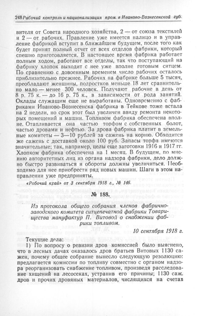 Из протокола общего собрания членов фабрично-заводского комитета ситцепечатной фабрики Товарищества мануфактур П. Витовой о снабжении фабрики топливом. 10 сентября 1918 г.