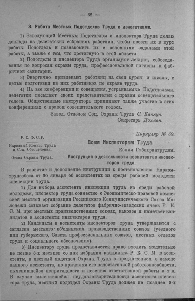 Циркуляр № 68 Отдела охраны труда Народного комиссариата труда и социального обеспечения РСФСР. Инструкция о деятельности ассистентов инспекторов труда. [Без даты]