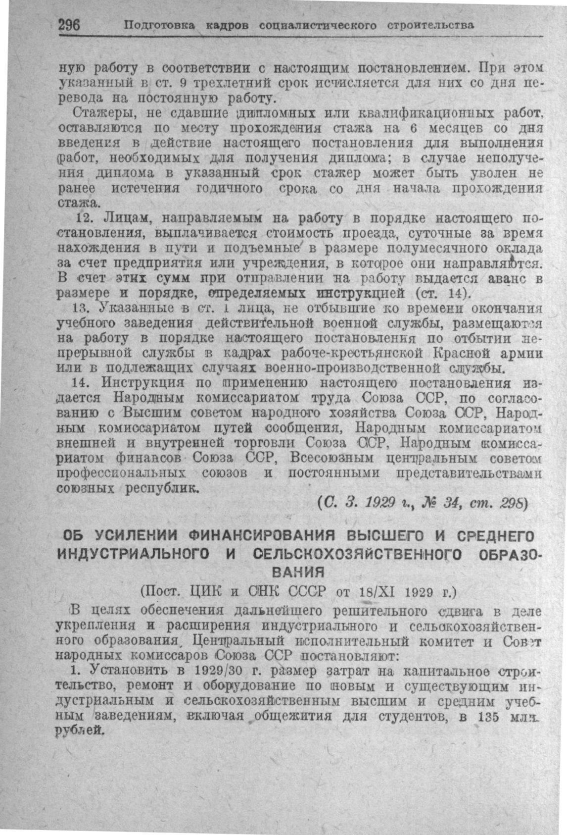 Об усилении финансирования высшего и среднего индустриального и сельскохозяйственного образования (Пост. ЦИК и СНК СССР от 18/XI 1929 г.) // С. З. 1929 г., № 72, ст. 691.