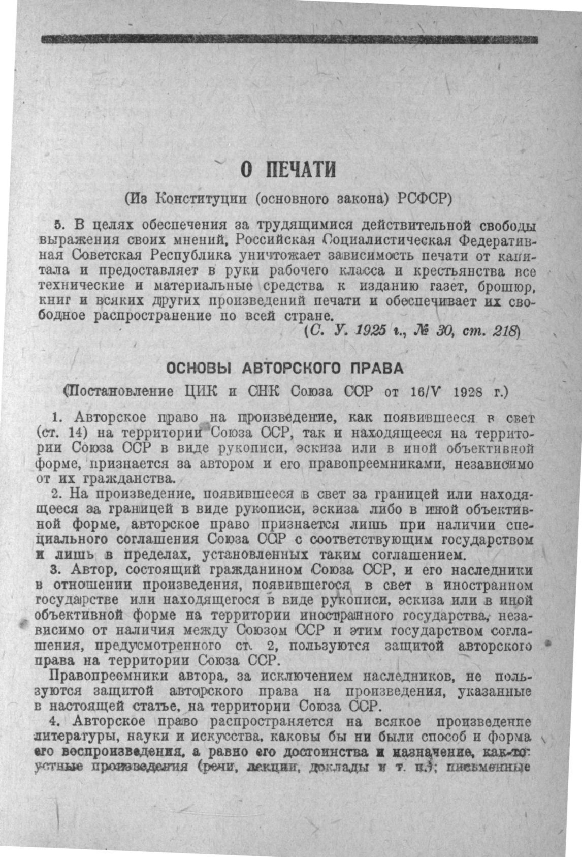 Основы авторского права (Постановление ЦИК и CHK Союза ССР от 16/V 1928 г.) // С. З. 1928 г., № 27, ст. 245.