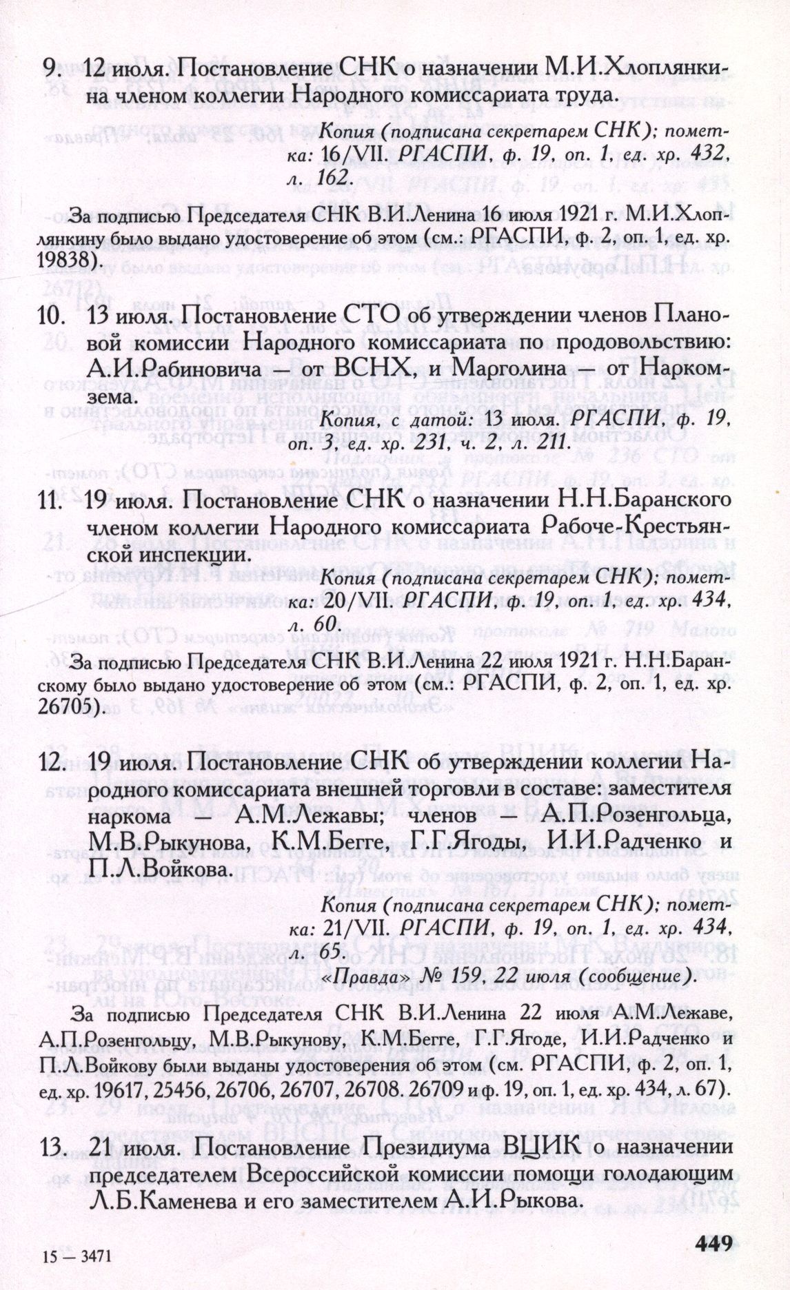 13 июля. Постановление СТО об утверждении членов Плановой комиссии Народного комиссариата по продовольствию: А.И.Рабиновича — от ВСНХ, и Марголина — от Наркомзема // Копия, с датой: 13 июля. РГАСПИ, ф. 19, oп. 3, ед. хр. 231, ч. 2, л. 211.
