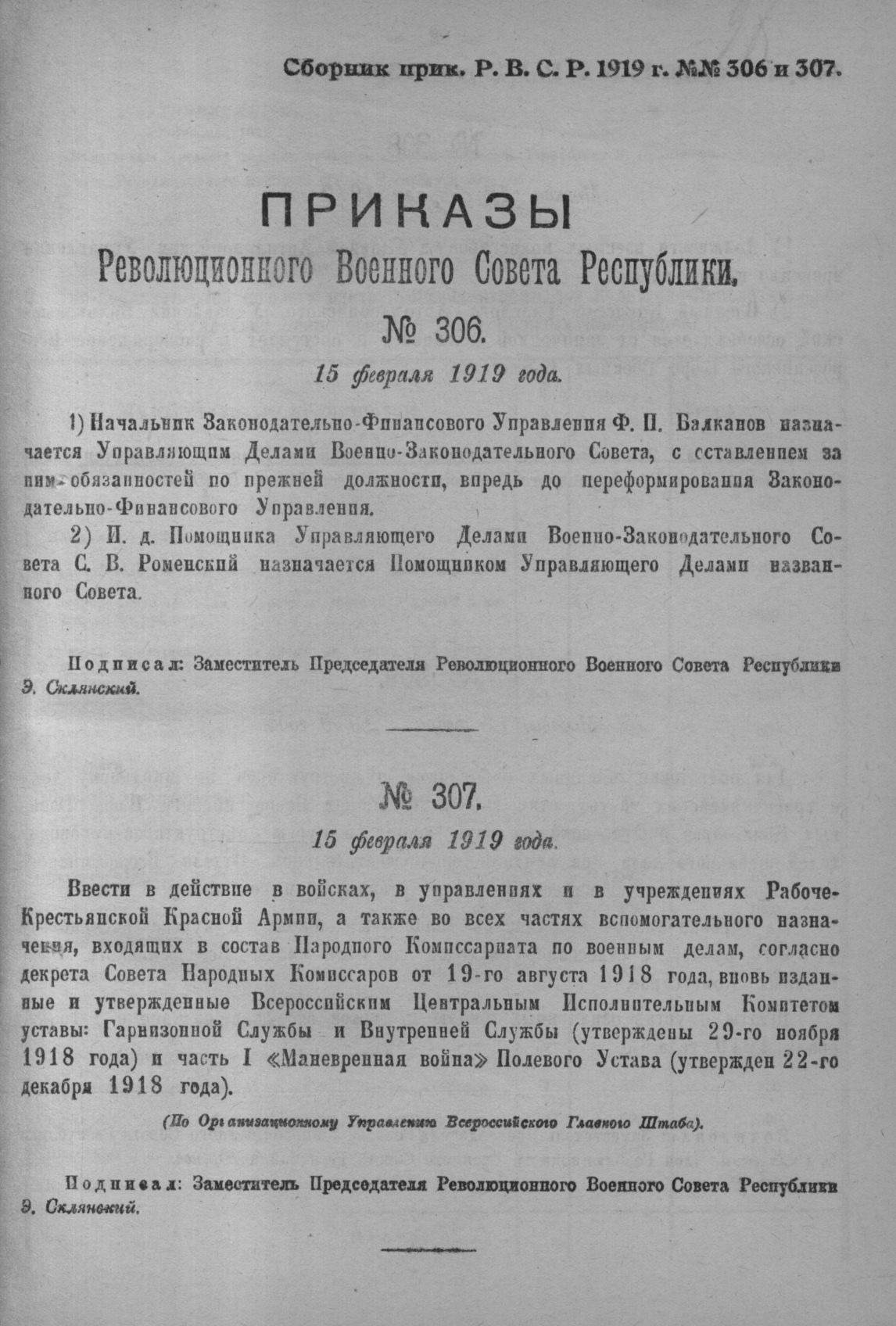 Приказ Революционного Военного Совета Республики № 307. 15 февраля 1919 года (По Организационному Управлению Всероссийского Главного Штаба)