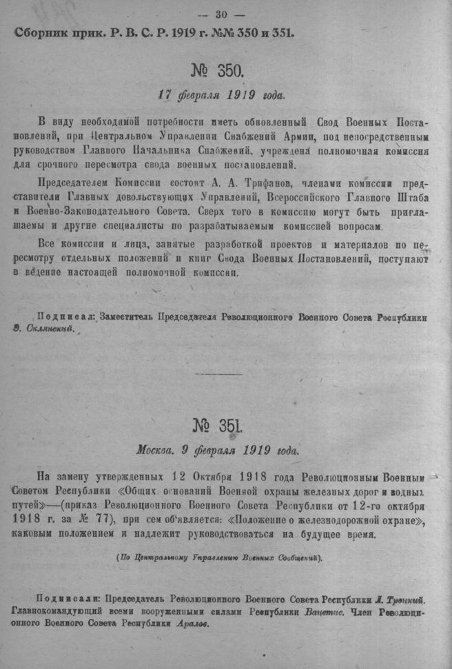 Приказ Революционного Военного Совета Республики № 351. 9 февраля 1919 года (По Центральному Управлению Военных Сообщений)