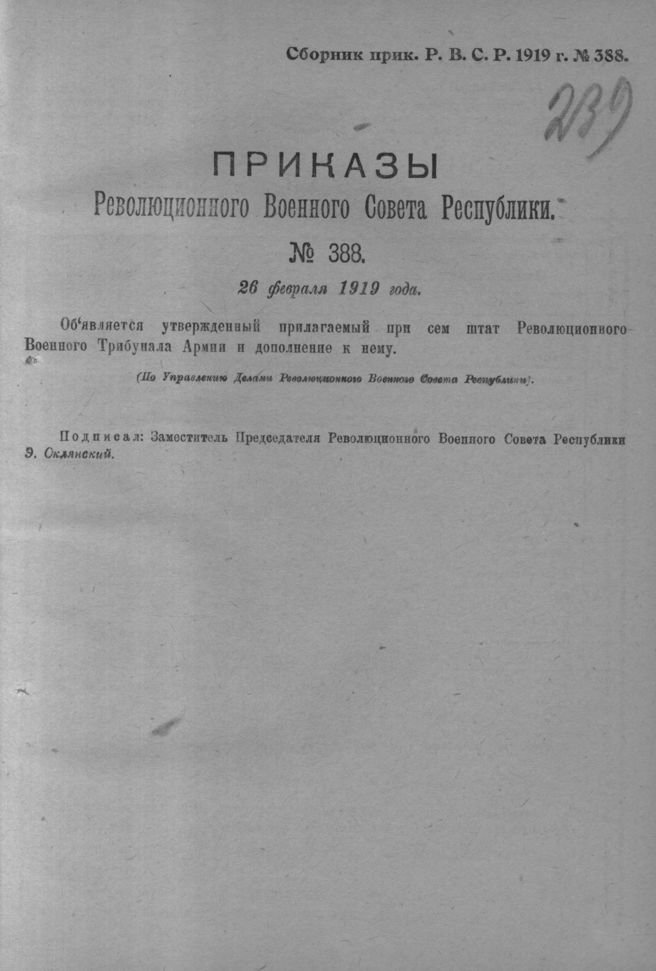 Приказ Революционного Военного Совета Республики № 388. 26 февраля 1919 года (По Управлению Делами Революционного Военного Совета Республики)