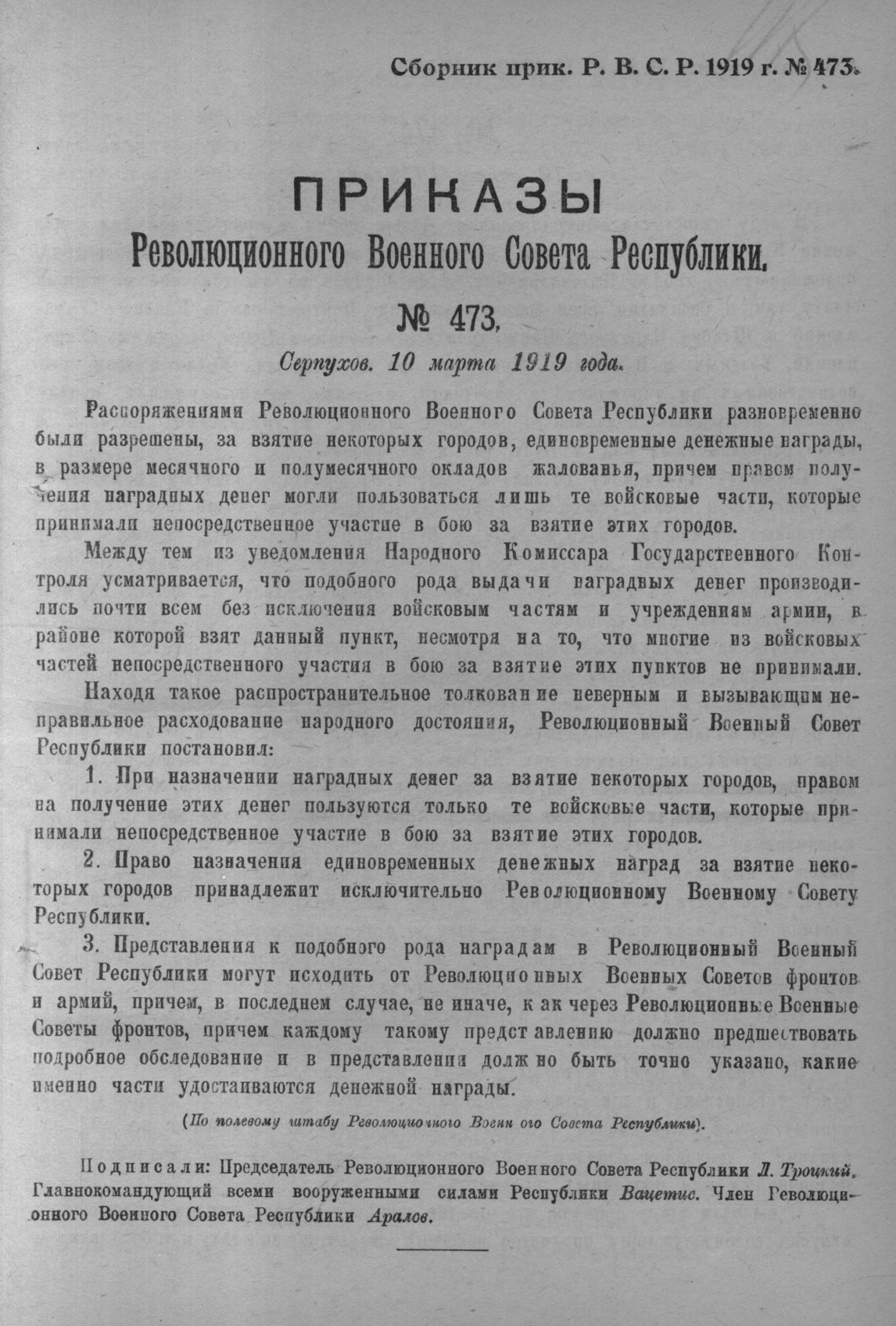 Приказ Революционного Военного Совета Республики № 473. 10 марта 1919 года (По полевому штабу Революционного Военного Совета Республики)