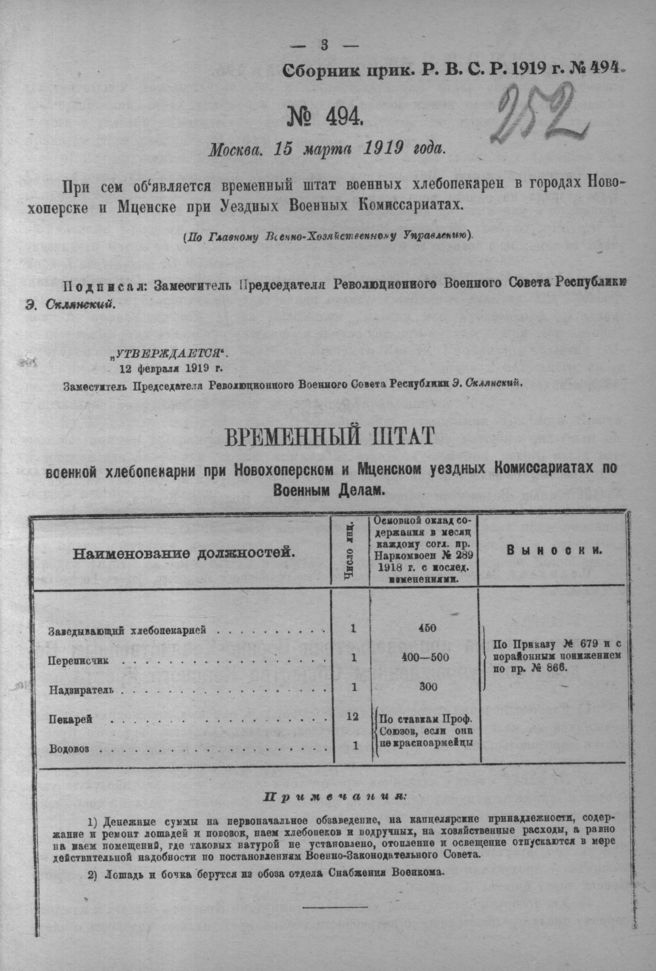 Приказ Революционного Военного Совета Республики № 494. 15 марта 1919 года (По Главному Военно-Хозяйственному Управлению)
