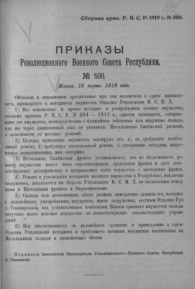 Приказ Революционного Военного Совета Республики № 500. 16 марта 1919 года