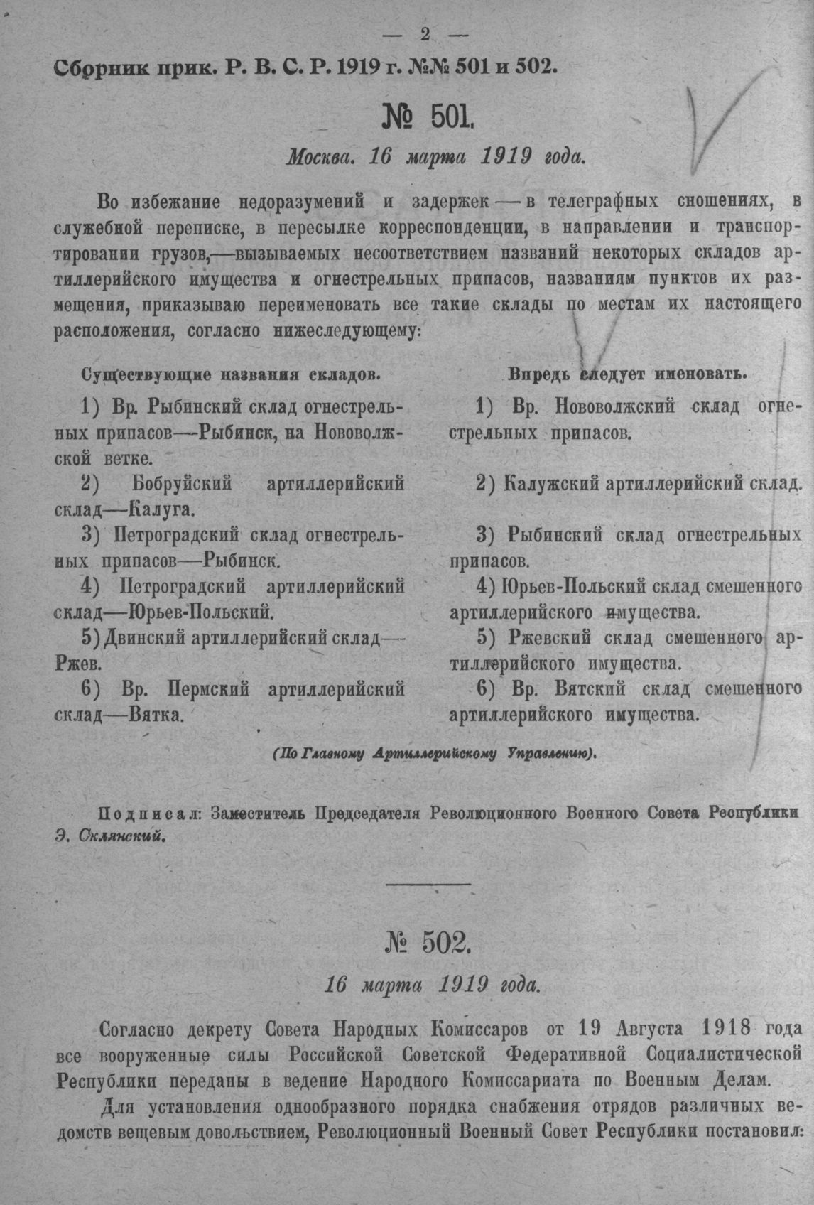 Приказ Революционного Военного Совета Республики № 501. 16 марта 1919 года (По Главному Артиллерийскому Управлению)