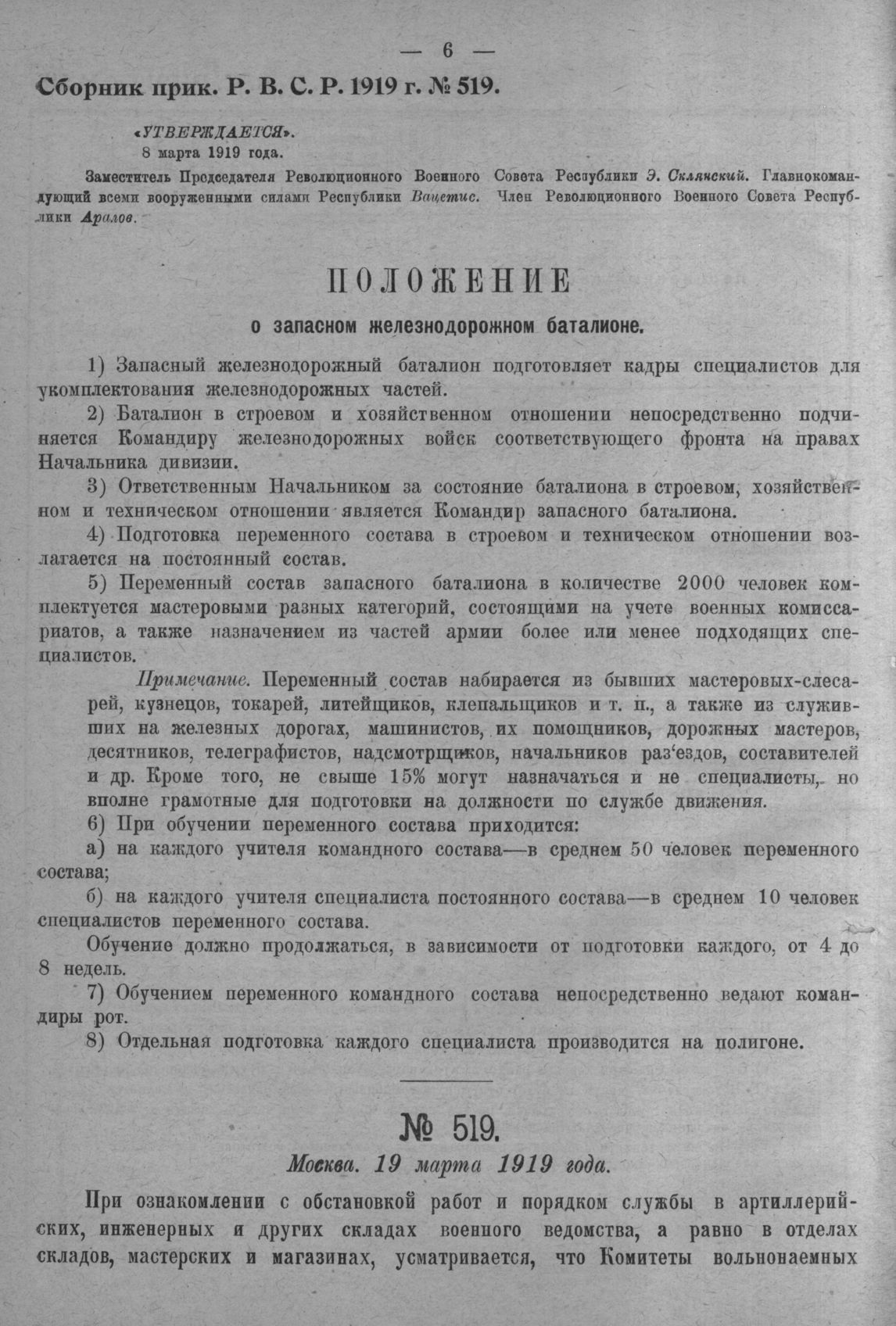 Приказ Революционного Военного Совета Республики № 519. 19 марта 1919 года (По Техническому Комитету при Центральном Управлении Снабжений)