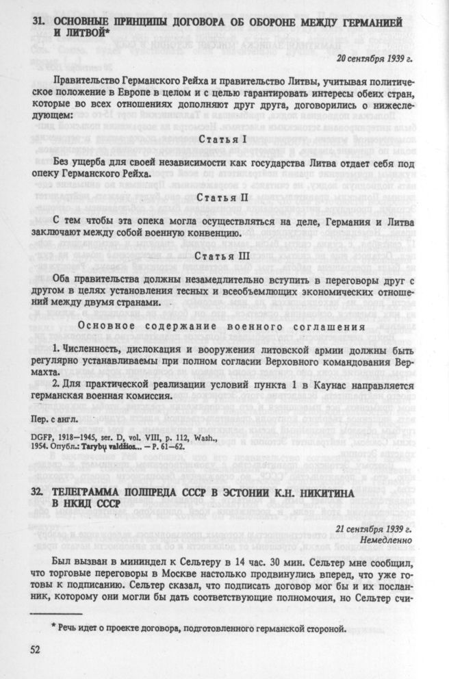 Основные принципы договора об обороне между Германией и Литвой. 20 сентября 1939 г. // Documents on German Foreign Policy (DGFP). 1918-1945, set. D, vol. VIII, р. 112, Wash., 1954. Опубл.: Tarybų valdžios atkūrimas Lietuvoje. 1940 metai: Dokumentu rinkinys. V., 1986, p. 61-62.