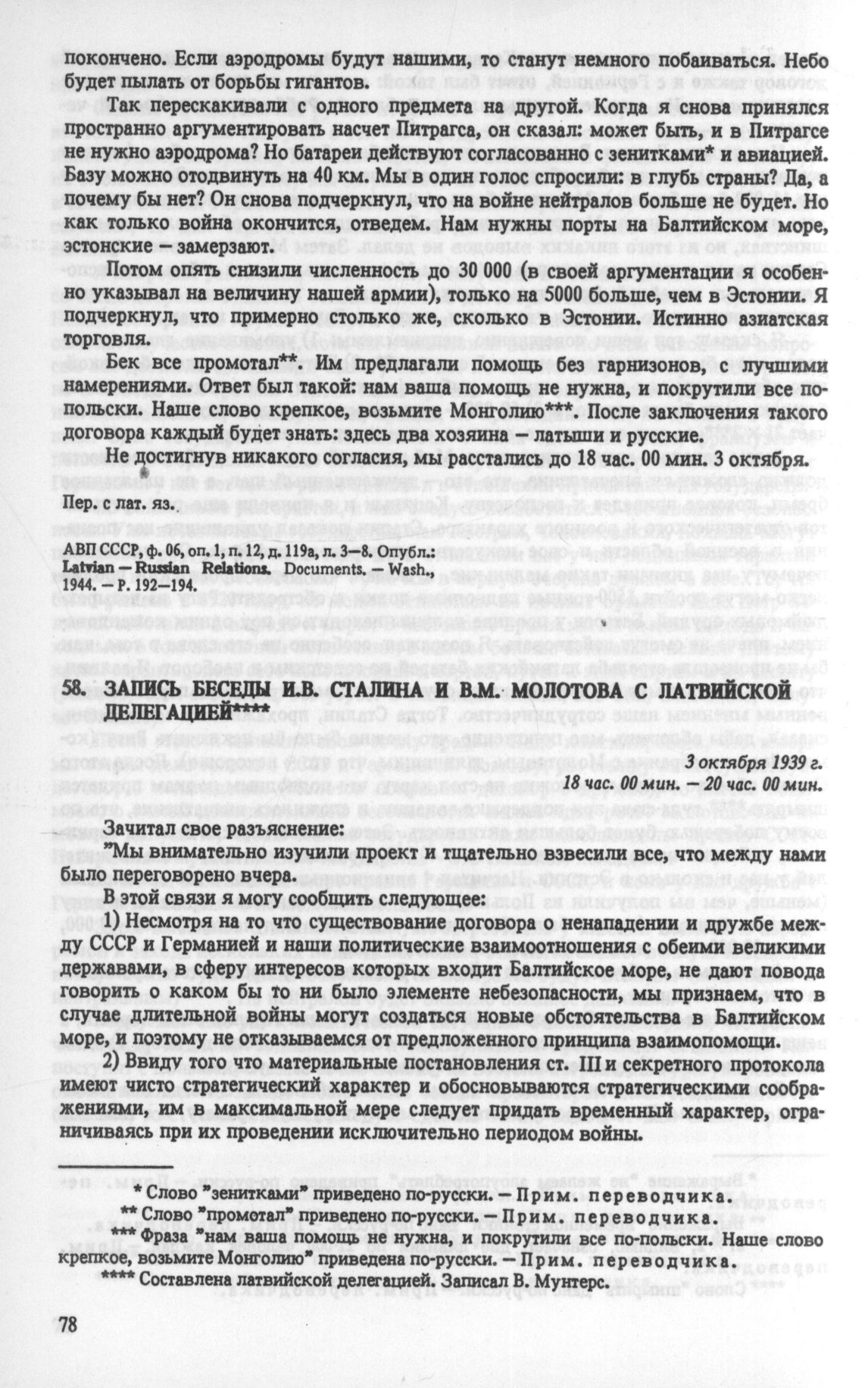 Запись беседы И. В. Сталина и В. М. Молотова с латвийской делегацией. 3 октября 1939 г. // АВП СССР, ф. 06, oп. 1, п. 12, д. 119а, л. 9—17. Опубл.: Latvian — Russian Relations. Documents. — Wash., 1944. - P. 194-198.