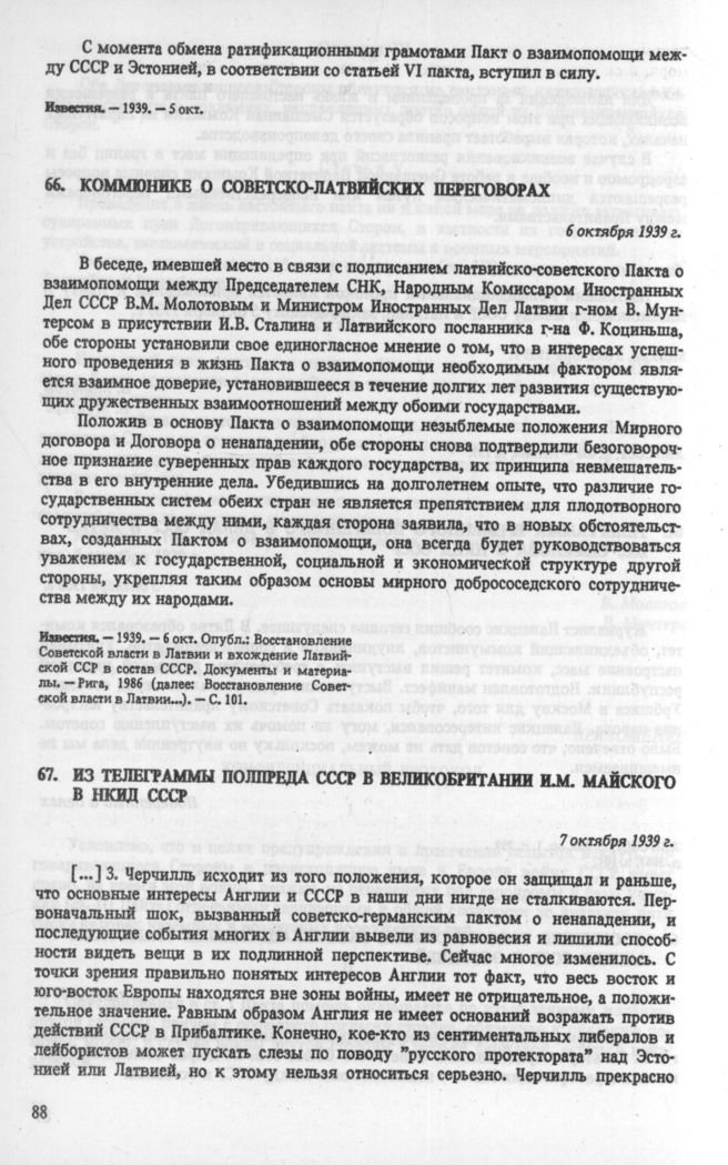 Коммюнике о советско-латвийских переговорах. 6 октября 1939 г. // Известия. — 1939 — 6 окт. Опубл.: Восстановление Советской власти в Латвии и вхождение Латвийской ССР в состав СССР. Документы и материалы .—Рига, 1986 (далее: Восстановление Советской власти в Латвии...). С. 101.