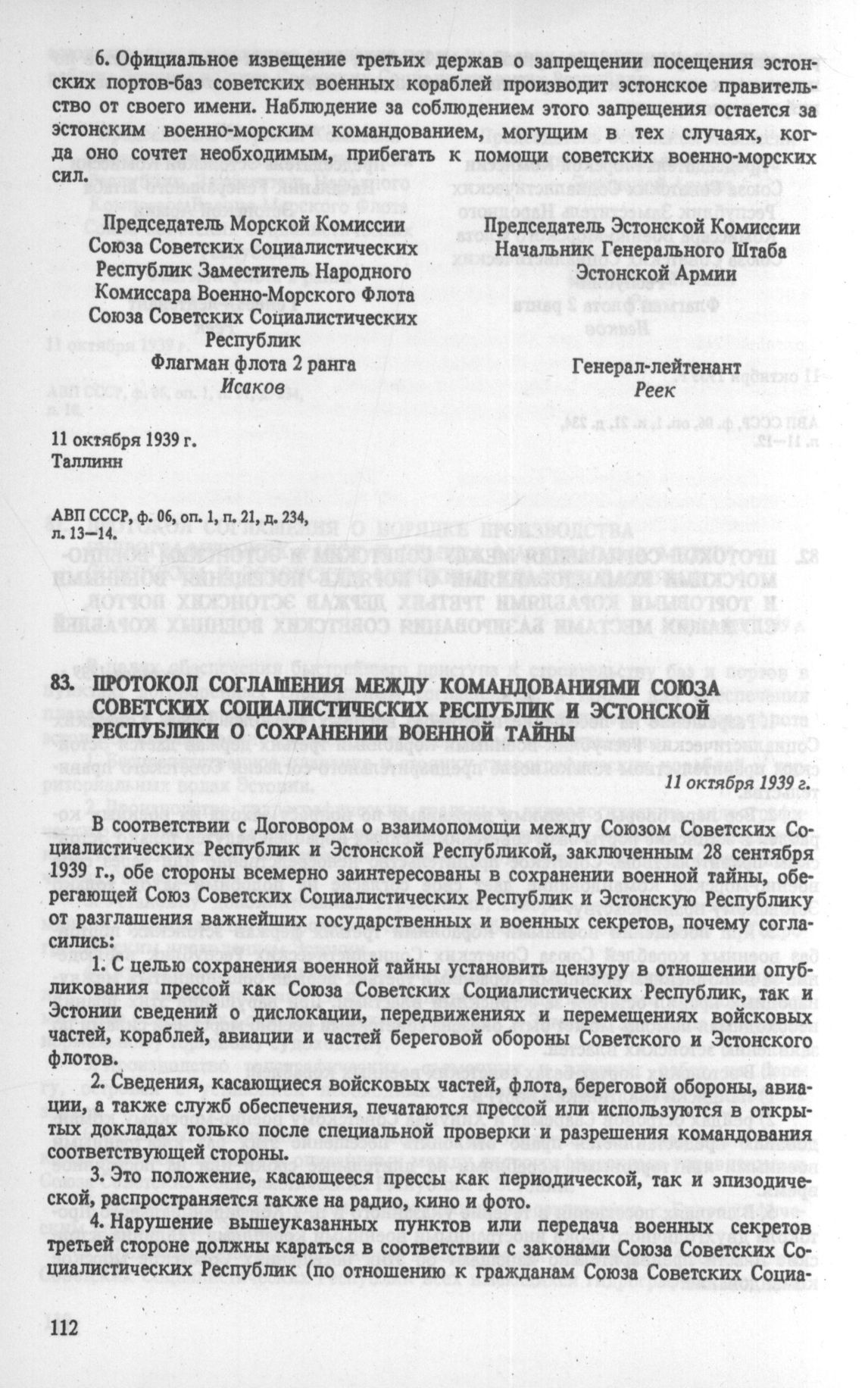 Протокол соглашения между командованиями Союза Советских Социалистических Республик и Эстонской Республикой о сохранении военной тайны. 11 октября 1939 г. // АВП СССР, ф. 06, oп. 1, п. 21, д. 234, л. 15-16.