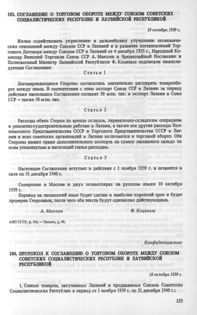 Соглашение о торговом обороте между Союзом Советских Социалистических Республик и Эстонской Республикой. 18 октября 1939 г. // АВП СССР, ф. 03а — Латвия, д. 06.