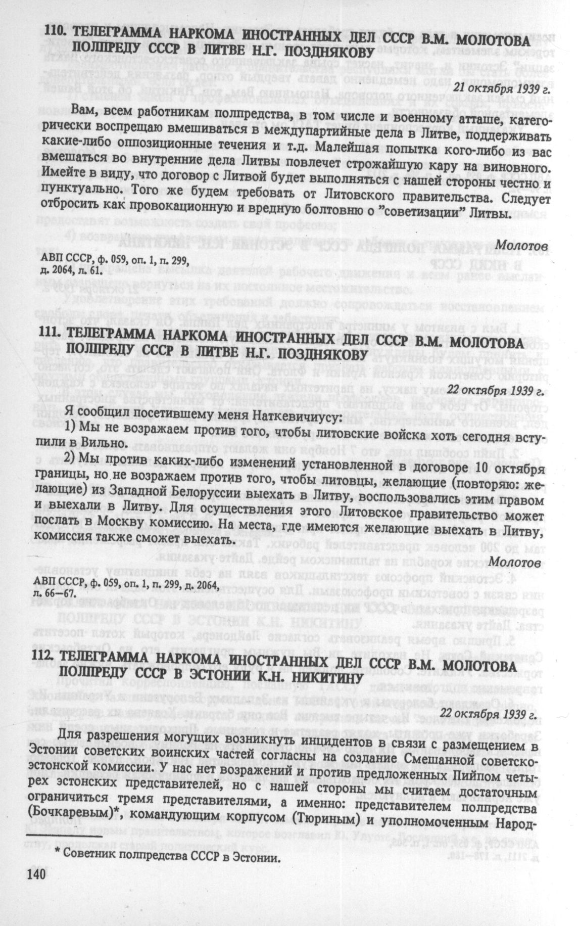 Телеграмма наркома иностранных дел СССР В. М. Молотова полпреду СССР в Литве Н. Г. Позднякову. 22 октября 1939 г. // АВП СССР, ф. 059, oп. 1, п. 299, д. 2064, л. 66-67.