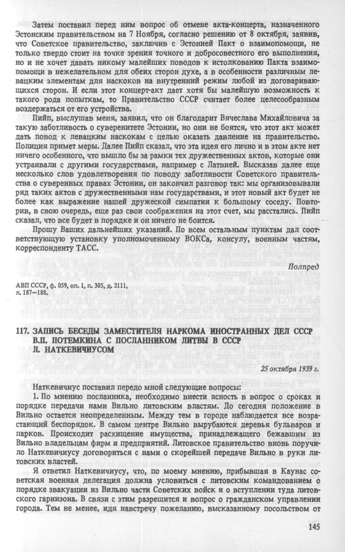Запись беседы заместителя наркома иностранных дел СССР В. П. Потемкина с посланником Литвы в СССР Л. Наткевичиусом. 25 октября 1939 г. // АВП СССР, ф. 06, oп. 1, п. 12, д. 127, л. 21-24.