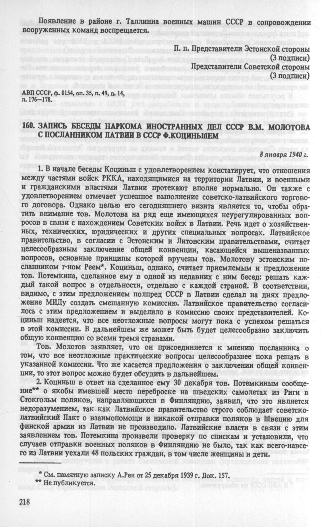 Запись беседы наркома иностранных дел СССР В. М. Молотова с посланником Латвии в СССР Ф. Коциньшем. 8 января 1940 г. // АВП СССР, ф. 06, оп. 2, п. 21, д. 239, л. 1-3.