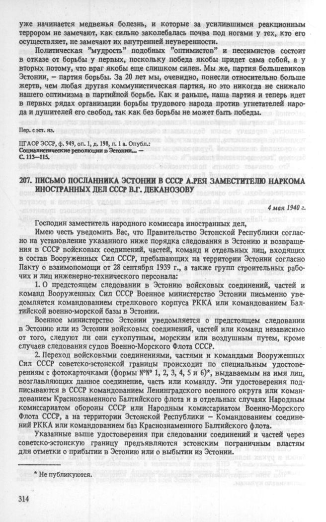 Письмо посланника Эстонии в СССР А. Рея заместителю наркома иностранных дел СССР В. Г. Деканозову. 4 мая 1940 г. // АВП СССР, ф. 03а — Эстония, д. 025.
