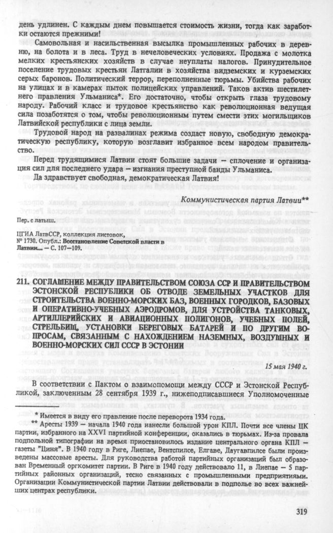 Соглашение между Правительством Союза ССР и Правительством Эстонской Республики об отводе земельных участков для строительства военно-морских баз, военных городков, базовых и оперативно-учебных аэродромов, для устройства танковых, артиллерийских и авиационных полигонов, учебных полей, стрельбищ, установки береговых батарей и по другим вопросам, связанным с нахождением наземных, воздушных и военно-морских сил СССР накануне 15 мая 1940 г. в Эстонии. 15 мая 1940 г. // АВП СССР, ф. 03а — Эстония, д. 026.