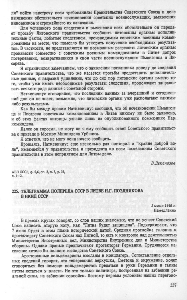 Телеграмма полпреда СССР в Литве Н. Г. Позднякова в НКИД СССР. 2 июня 1940 г. // АВП СССР, ф. 059, oп. 1, п. 323, д. 2221, л. 118-119.