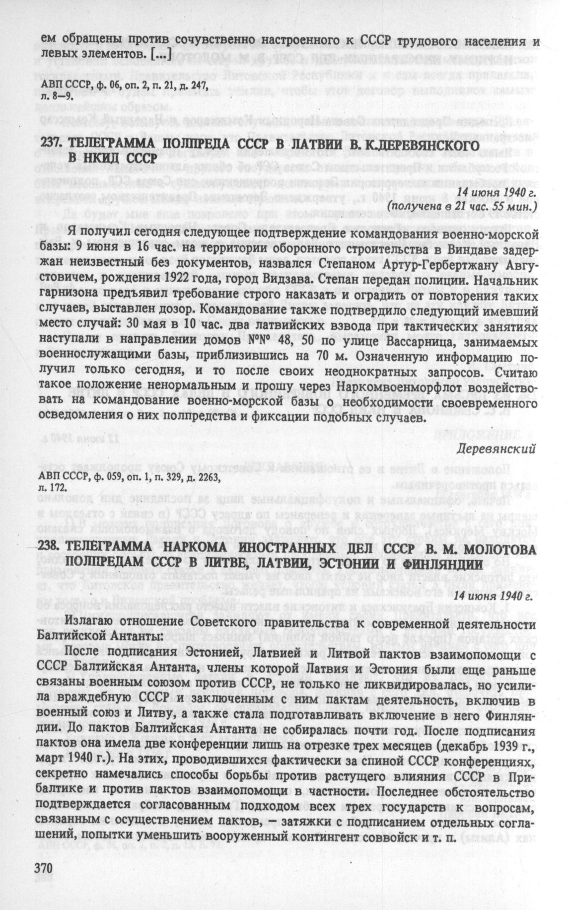 Телеграмма полпреда СССР в Латвии В. К. Деревянского в НКИД СССР. 14 июня 1940 г. // АВП СССР, ф. 059, oп. 1, п. 329, д. 2263, л. 172.