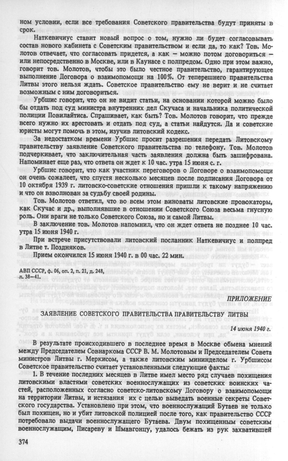 Приложение. Заявление Советского правительства правительству Литвы. 14 июня 1940 г. // АВП СССР, ф. 06, oп. 2, п. 21, д. 248, л. 42-44. Опубл.: «Известия». — 1940. — 16 июня.