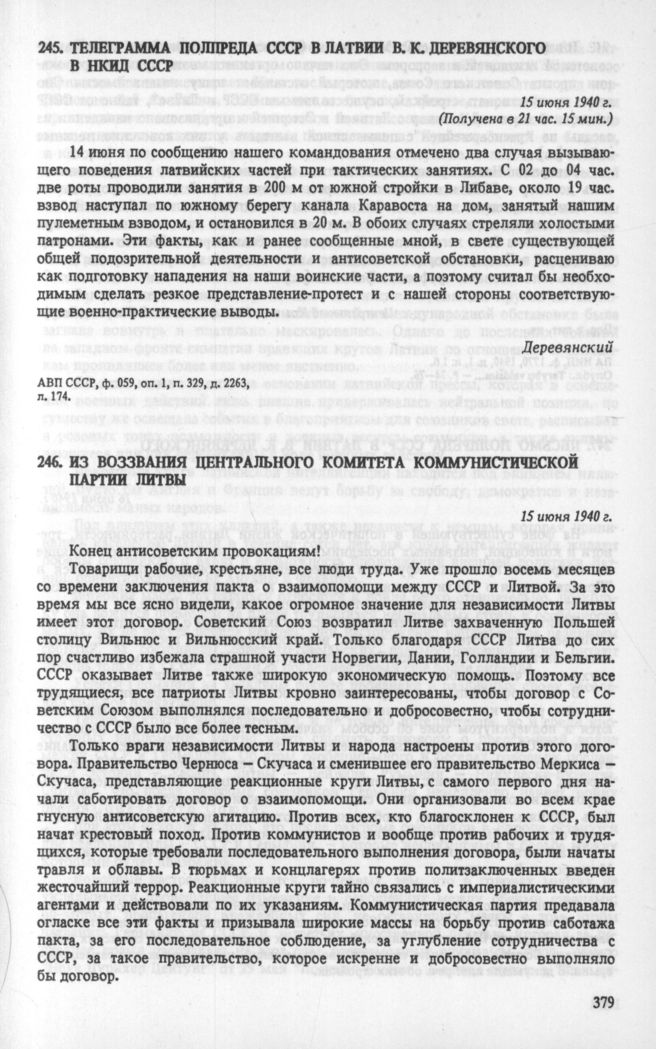 Из воззвания Центрального Комитета Коммунистической партии Литвы. 15 июня 1940 г. // ПА ИИП, ф. 1770, 1940, д. 1, л. 1 б. Опубл.: Tarybų valdžios atkūrimas Lietuvoje. 1940 metai: Dokumentu rinkinys. V., 1986, — Р. 74—76.