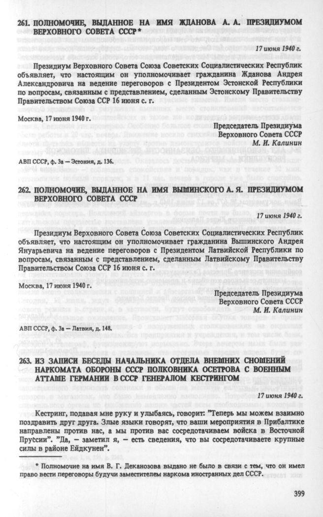 Полномочие, выданное на имя Жданова А. А. Президиумом Верховного Совета СССР. 17 июня 1940 г. // АВП СССР, ф. За — Эстония, д. 136.