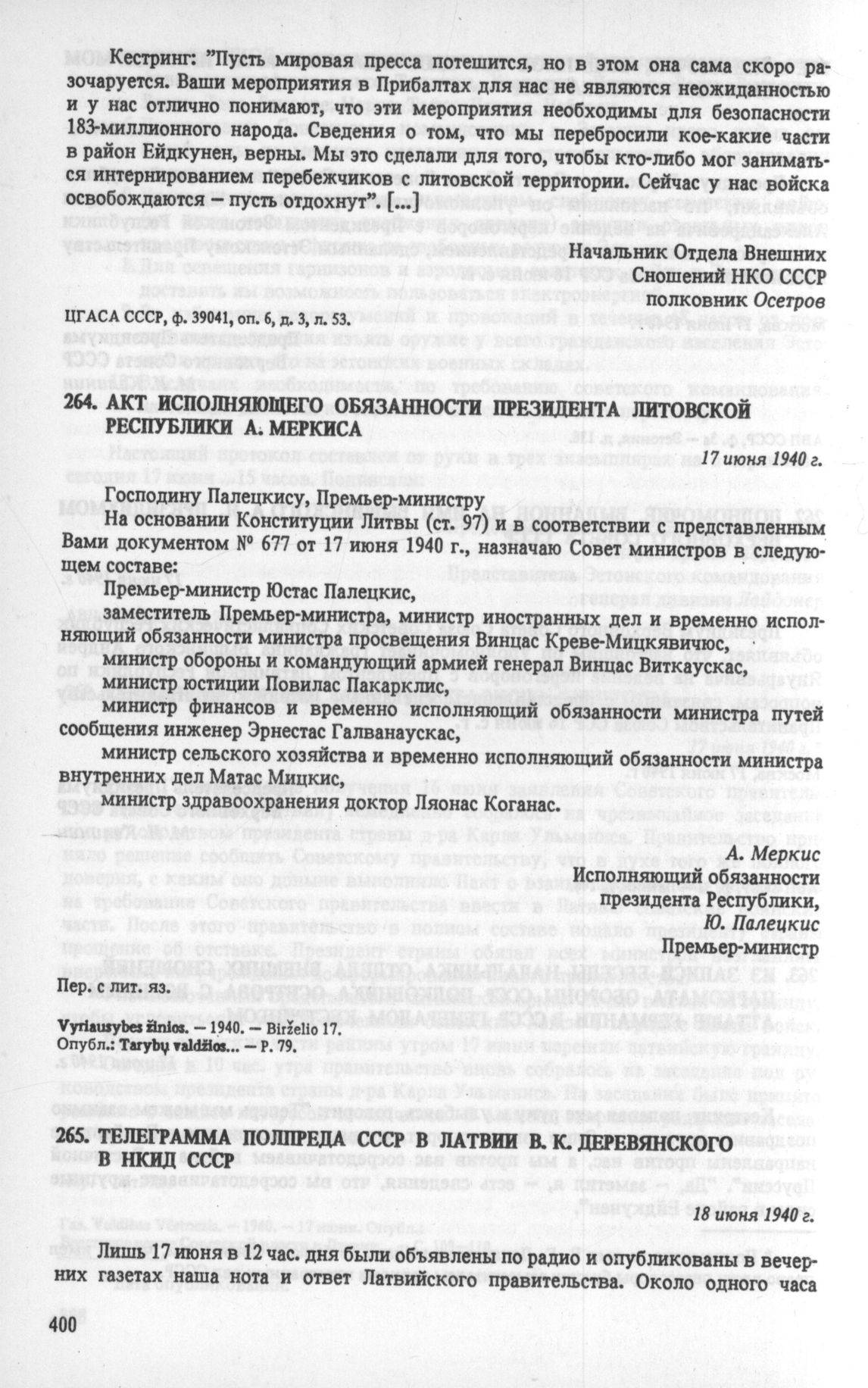 Акт исполняющего обязанности президента Литовской Республики А. Меркиса. 17 июня 1940 г. // Vyriamybes žinios. — 1940. — Birželio 17. Опубл.: Tarybų valdžios atkūrimas Lietuvoje. 1940 metai: Dokumentu rinkinys. V., 1986, — Р. 79.