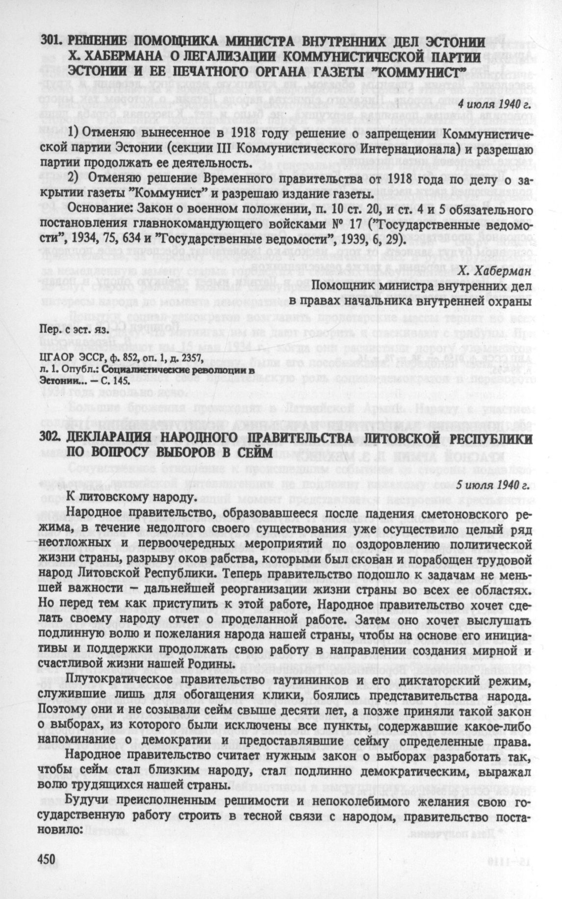 Решение помощника министра внутренних дел Эстонии X. Хабермана о легализации Коммунистической партии Эстонии и ее печатного органа газеты «Коммунист». 4 июля 1940 г. // ЦГАОР ЭССР, ф. 852, oп. 1, д. 2357, л. Опубл.: Социалистические революции в Эстонии и ее вхождение в состав СССР. 1917—1940. Документы и материалы. — Таллинн, 1987. — С. 145.