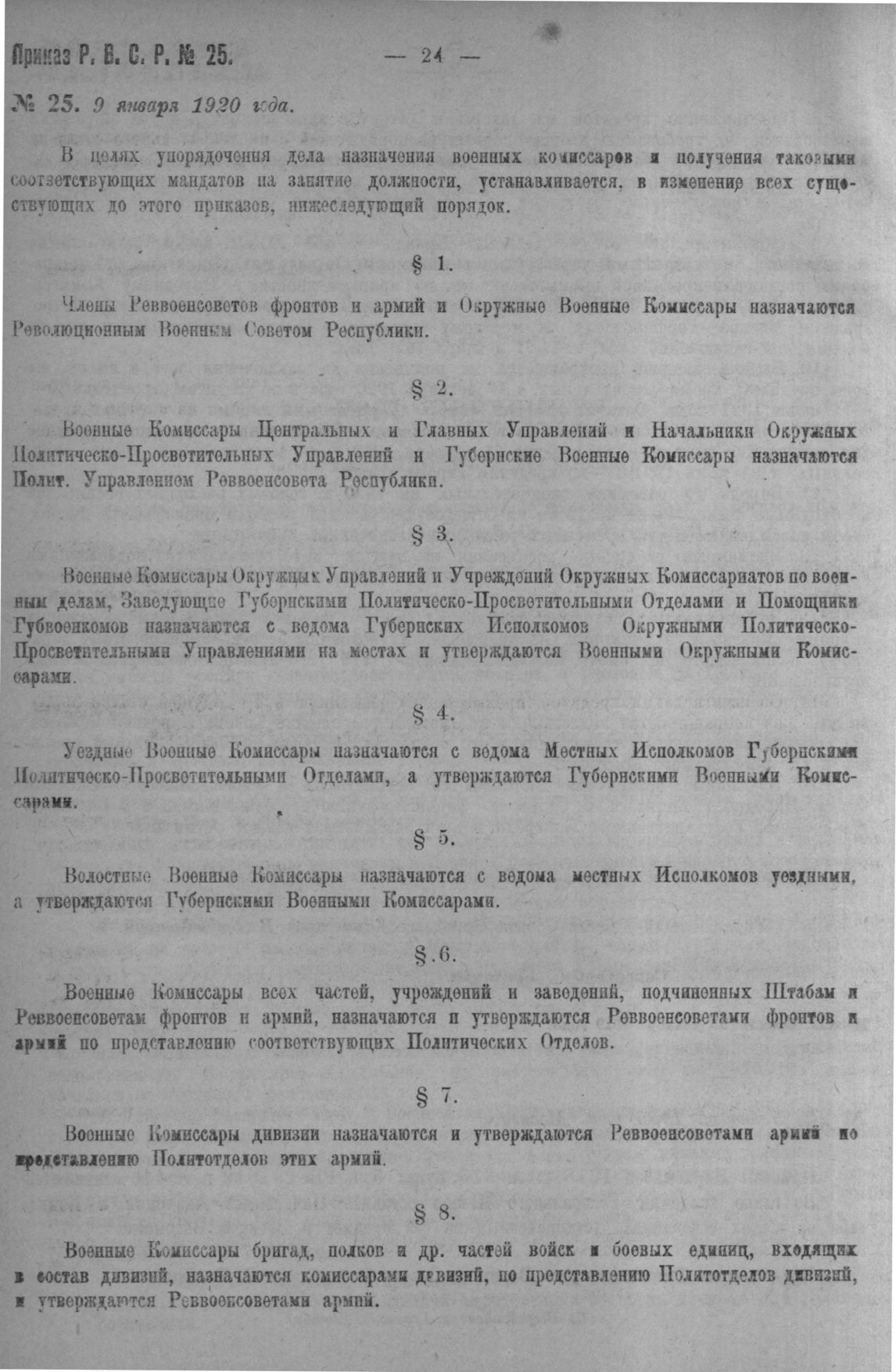 Приказ Революционного Военного Совета Республики № 25. О порядке назначения военных комиссаров. 9 января, 1920 года. (По Политичесхому Управлению Р. В. С. Р.)