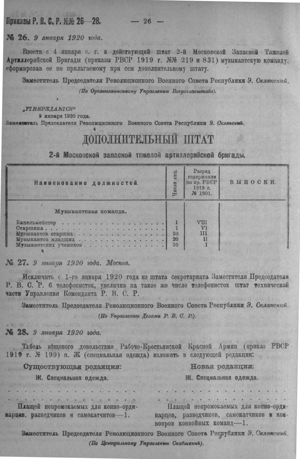 Приказ Революционного Военного Совета Республики № 26. О введении в штат 2 Московской Запасной Тяжелой Арт. бригады музыкантской команды. 9 января, 1920 года. (По Организационному Управлению Bcepoглавштаба)