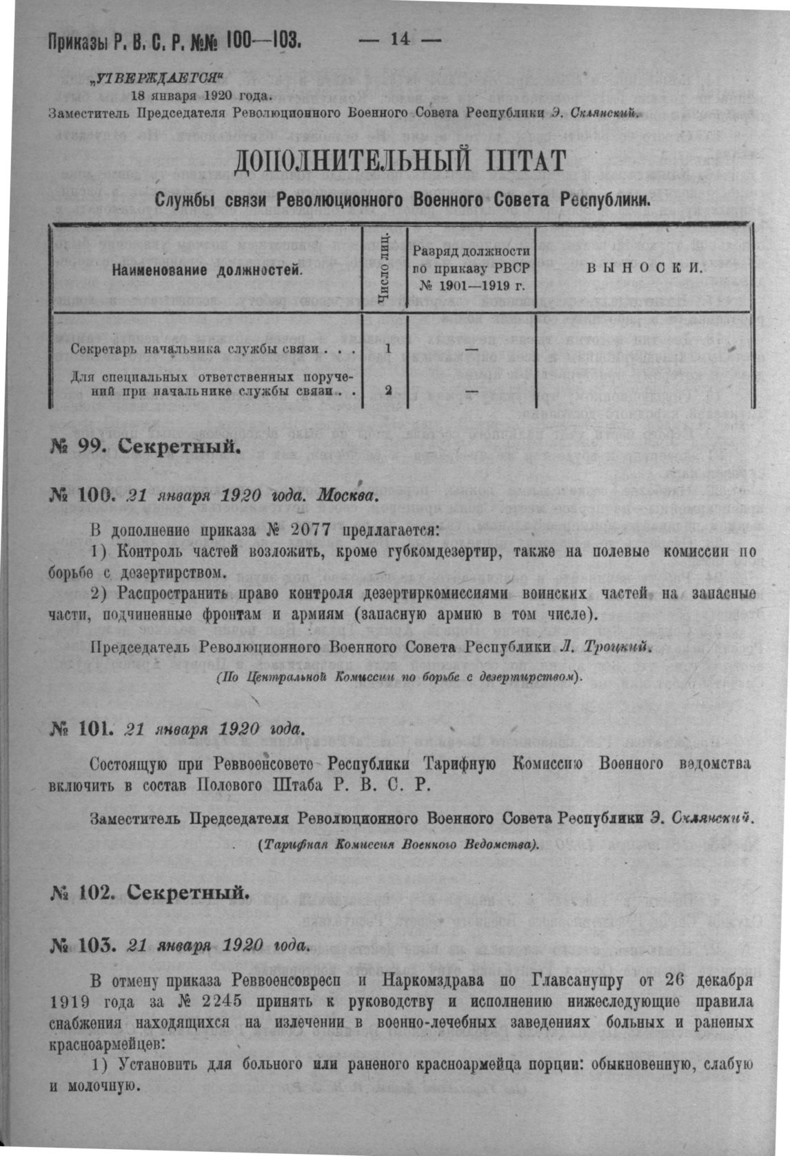 Приказ Революционного Военного Совета Республики № 103. Об объявлении повер. правил снабжения находящихся на излечении в военно-лечебных заведениях больных и раненых красноармейцев. 21 января, 1920 года. (По Главному Военно-Санитарному Управлению)