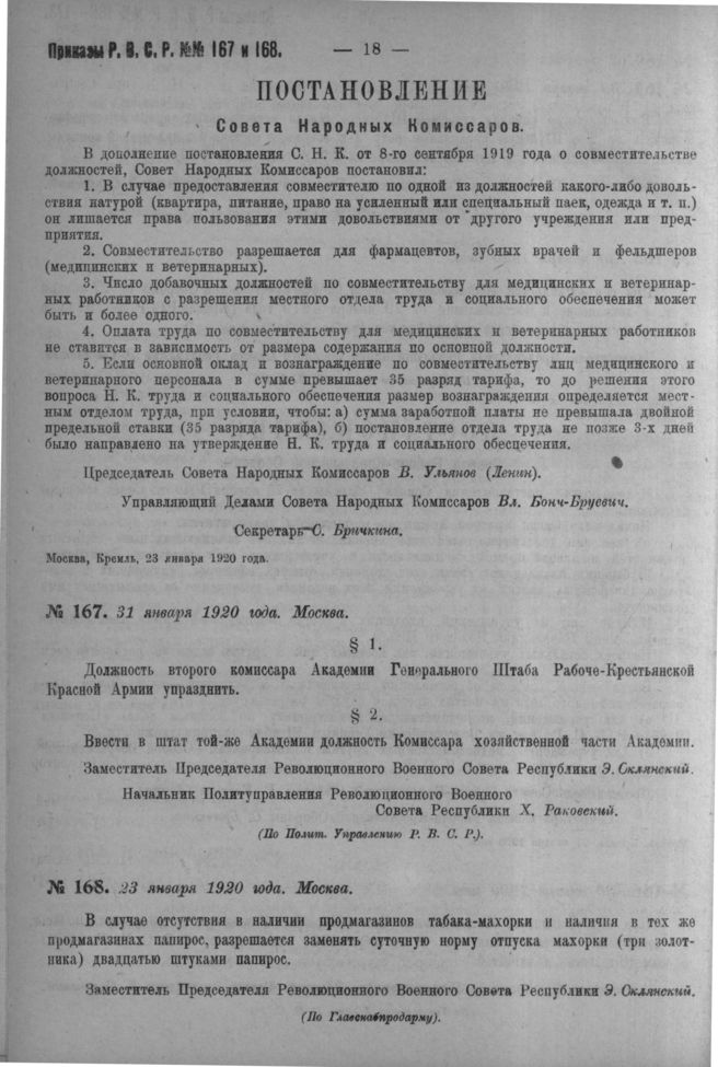 Приказ Революционного Военного Совета Республики № 167. Об упразднении должности 2-го комиссара Академии Генштаба и о введения в штат Академии должности Комиссара Хозяйственной части. 31 января, 1920 года. (По Полит. Управлению Р. В. С. Р.)