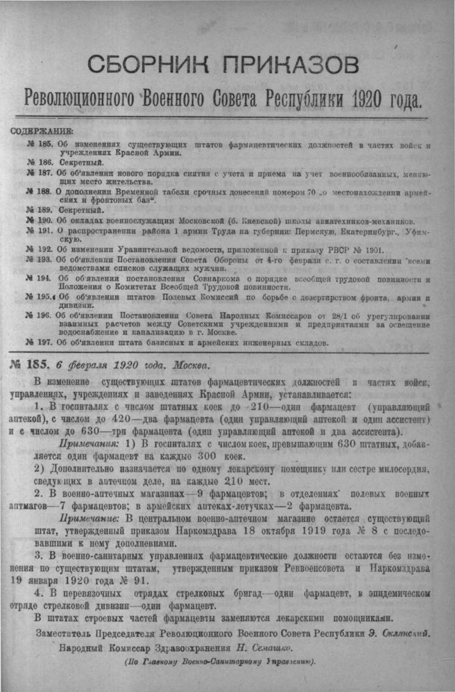 Приказ Революционного Военного Совета Республики № 185. Об изменениях существующих штатов фармацевтических должностей в частях войск и учреждениях Красной Армии. 6 февраля, 1920 года. (По Главному Военно-Санитарному Управлению)