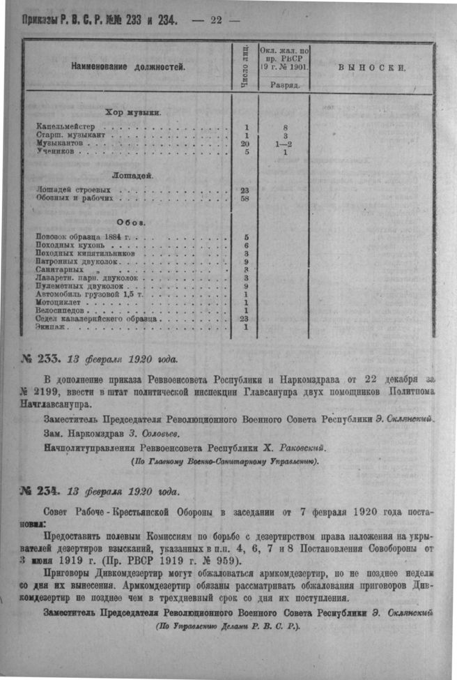 Приказ Революционного Военного Совета Республики № 234. 13 февраля, 1920 года. (По Управлению Делами Р. В. С. Р.)