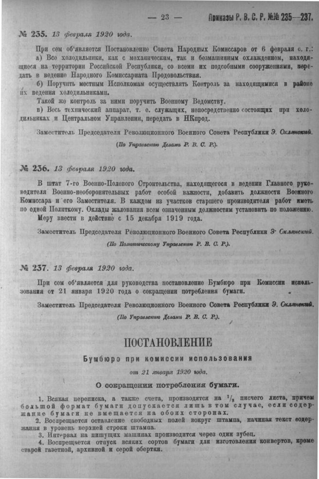 Приказ Революционного Военного Совета Республики № 237. 13 февраля, 1920 года. (По Управлению Делами Р. В. С. Р.)