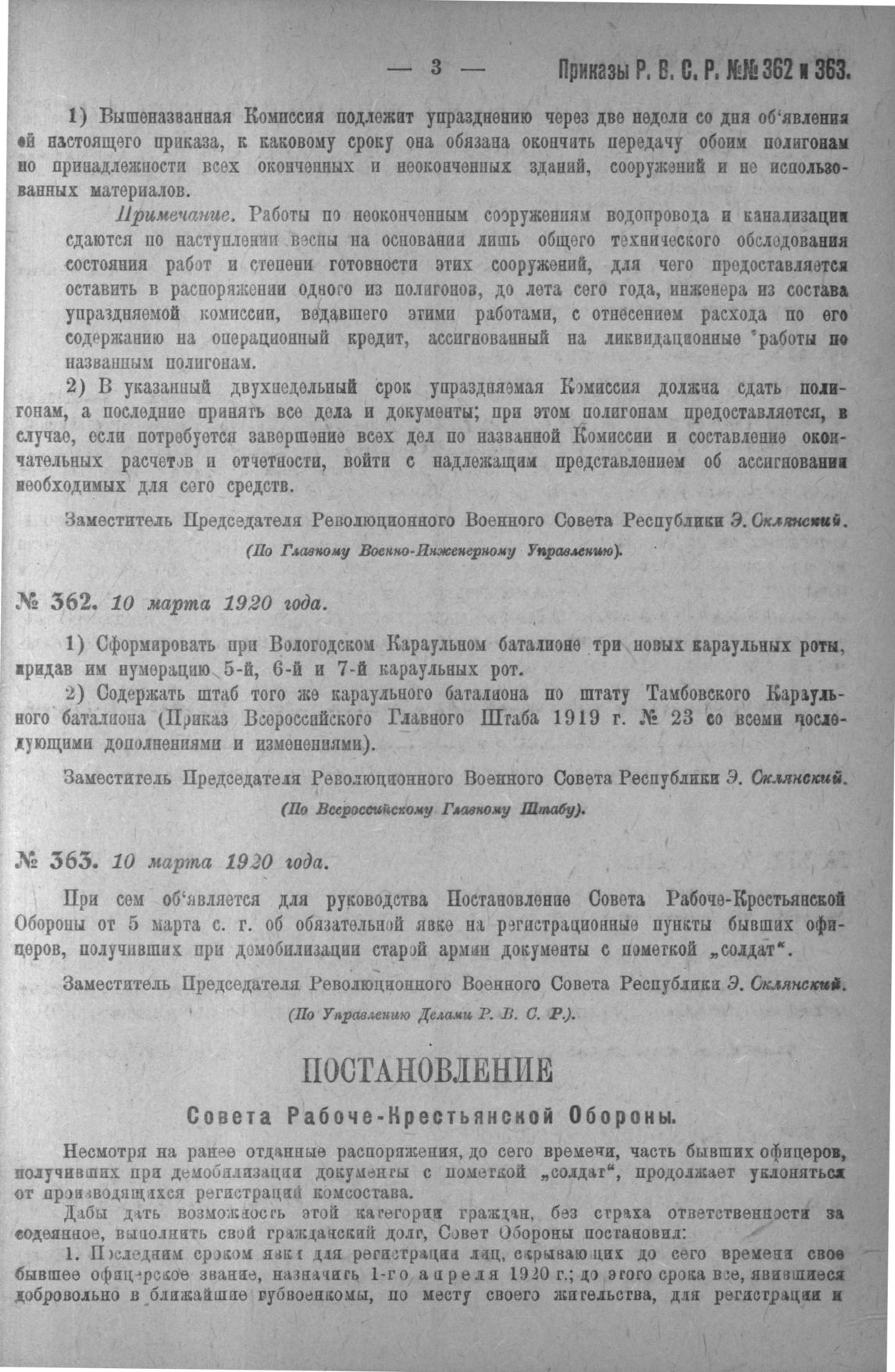 Приказ Революционного Военного Совета Республики № 362. О сформировании при Вологодском кар. батальоне трех новых караульных рот. 10 марта, 1920 года. (По Всероссийскому Главному Штабу)