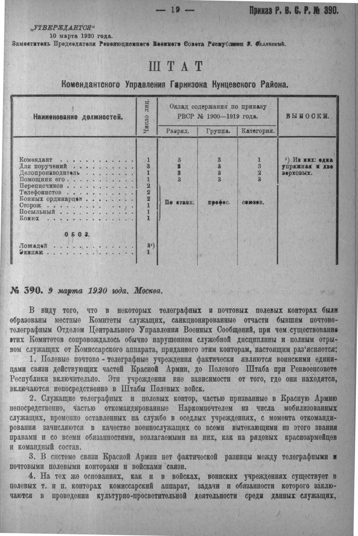 Приказ Революционного Военного Совета Республики № 390. Об административном строении полевых почтовых учреждений, комиссарском аппарате этих учреждений, характере производимой в них работы служащих и воспрещении создавать комитеты служащих. 9 марта, 1920 года. (По Управлению Связи Красной Армии)