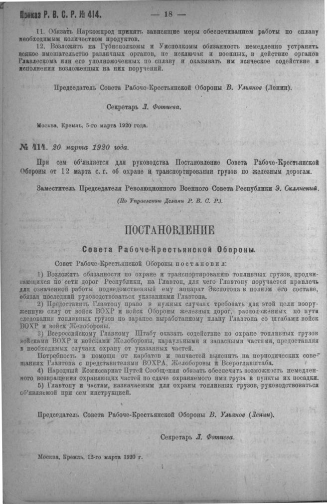 Приказ Революционного Военного Совета Республики № 414. Об объявлении Постановления Совета Обороны от 12 марта об охране и транспортировании грузов по железным дорогам. 20 марта, 1920 года. (По Управлению Делами Р. В. С. Р.)