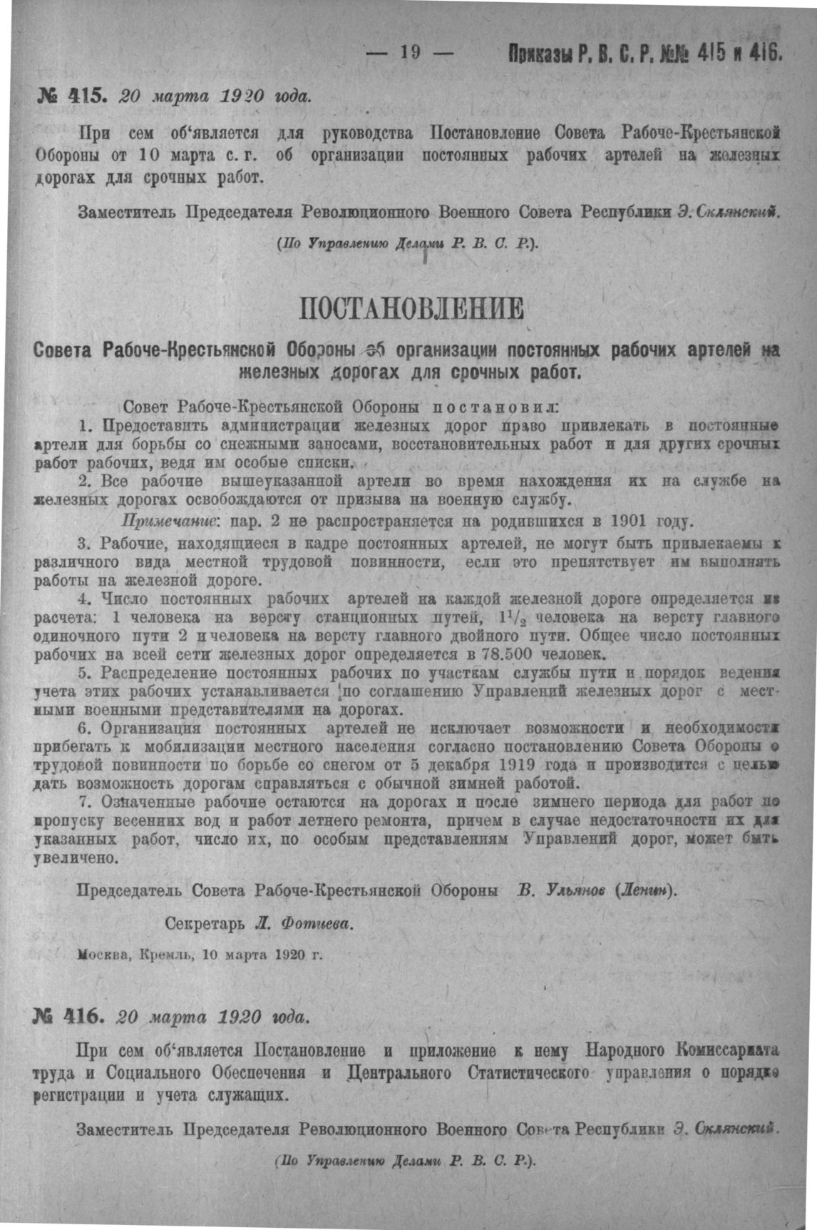 Приказ Революционного Военного Совета Республики № 416. Об объявлении Постановления и приложения к нему Наркомтруда и Социального Обеспечения и Центрального Статистического Управления о порядке регистрации и учета служащих. 20 марта, 1920 года. (По Управлению Делами Р. В. С. Р.)