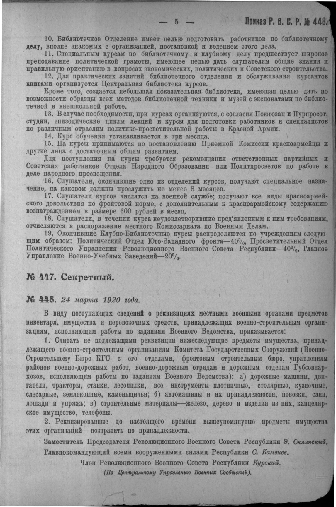 Приказ Революционного Военного Совета Республики № 448. О запрещении реквизиций местными военными органами предметов инвентаря, имущества и перевозочных средств, принадлежащих военно-строительным организациям. 24 марта, 1920 года. (По Центральному Управлению Военных Сообщений)