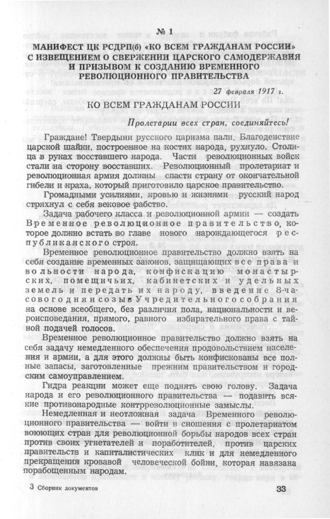 Манифест ЦК РСДРП(б) «Ко всем гражданам России» с извещением о свержении царского самодержавия и призывом к созданию Временного революционного правительства. 27 февраля 1917 г. // Газ. «Правда» № 1, 5 марта 1917 г.