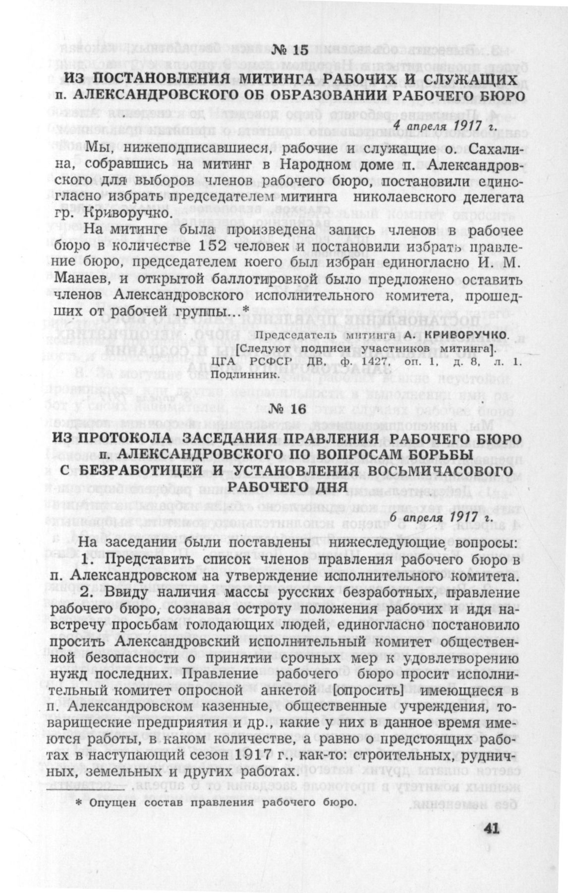 Из постановления митинга рабочих и служащих п. Александровского об образовании Рабочего бюро. 4 апреля 1917 г. // ЦГА РСФСР ДВ, ф. 1427, оп. 1, д. 8, л. 1. Подлинник.