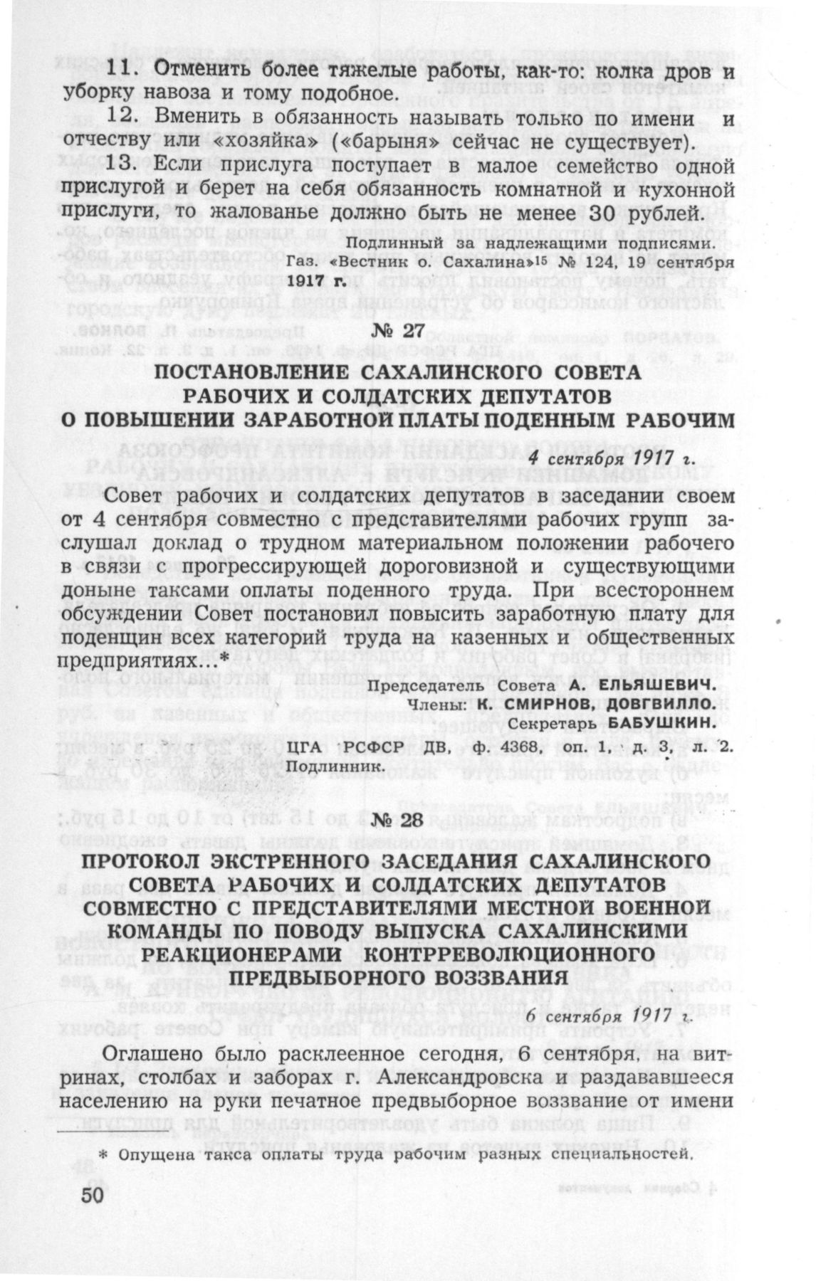 Протокол экстренного заседания Сахалинского Совета рабочих и солдатских депутатов совместно с представителями местной военной команды по поводу выпуска сахалинскими реакционерами контрреволюционного предвыборного воззвания. 6 сентября 1917 г. // ЦГАОР СССР, ф. 6978, оп. 1. д. 376, лл. 1-2. Подлинник.