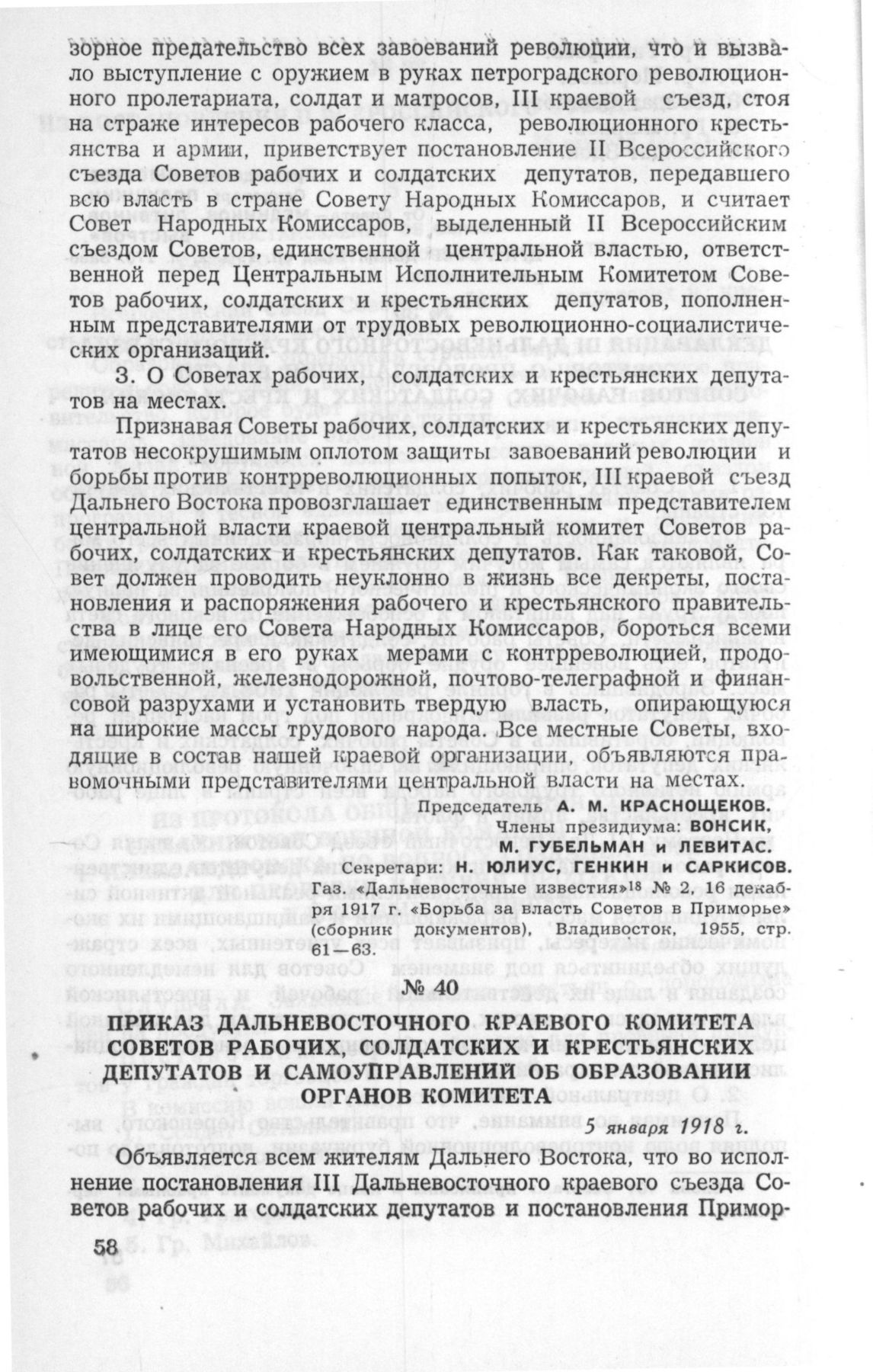 Приказ Дальневосточного краевого комитета Советов рабочих, солдатских и крестьянских депутатов и самоуправлений об образовании органов комитета. 5 января 1918 г.